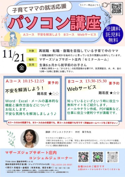 【マザーズジョブサポート庄内】 子育てママの就活応援 パソコン講座開催のお知らせ