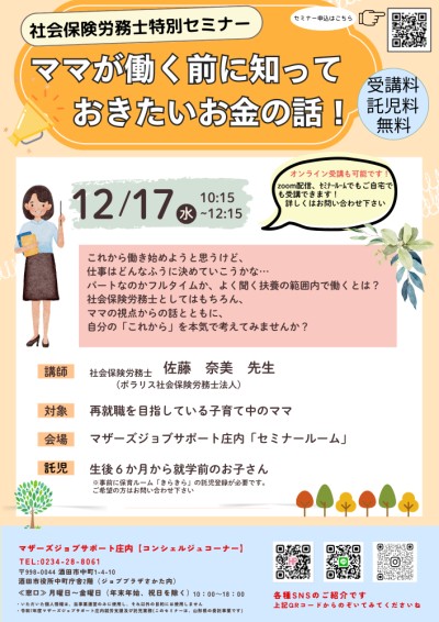 【マザーズジョブサポート庄内】社会保険労務士特別セミナー ~ママが働く前に知っておきたいお金の話~