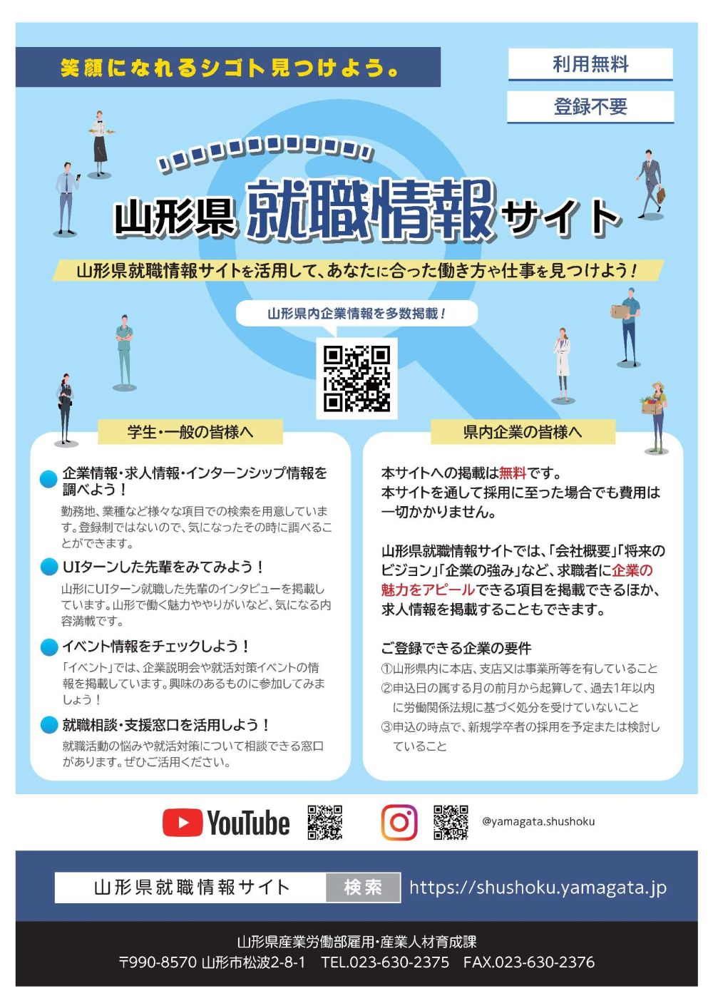 山形県内の企業へ就職を希望している方に対して、県内企業の情報を提供し、県内企業の認知度向上及び県内企業への就職促進を図ることを目的とし、県が運営するウェブサイト山形県就職情報サイトに掲載する企業を募集します。