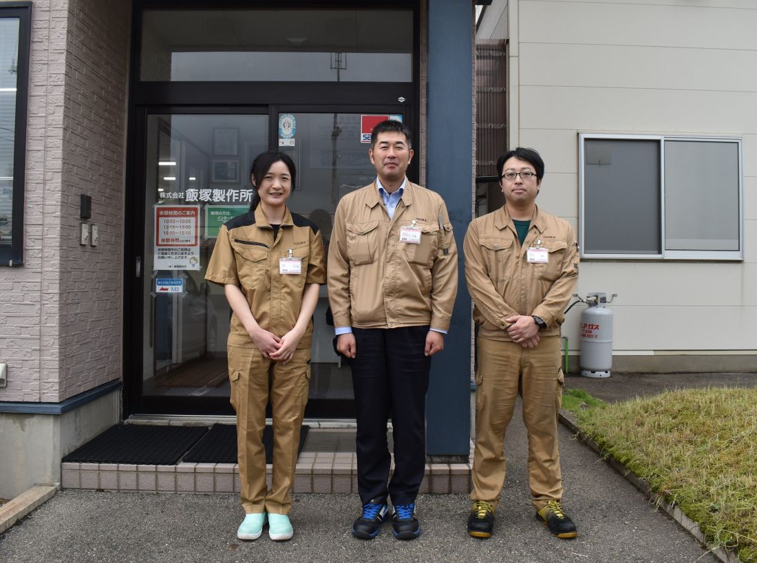 - 営業部 五十嵐 鮎さん(左)、代表取締役 経営管理部長 佐藤 正和さん(中央)、製造部 平野 誠也さん(右)